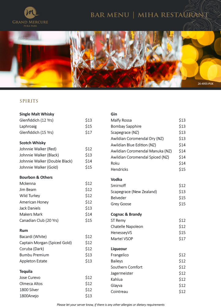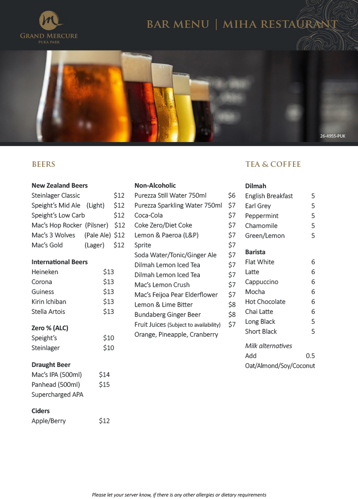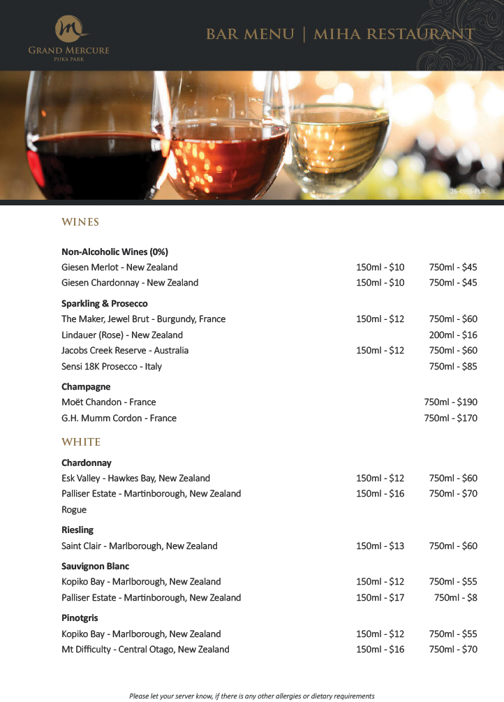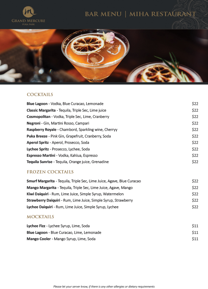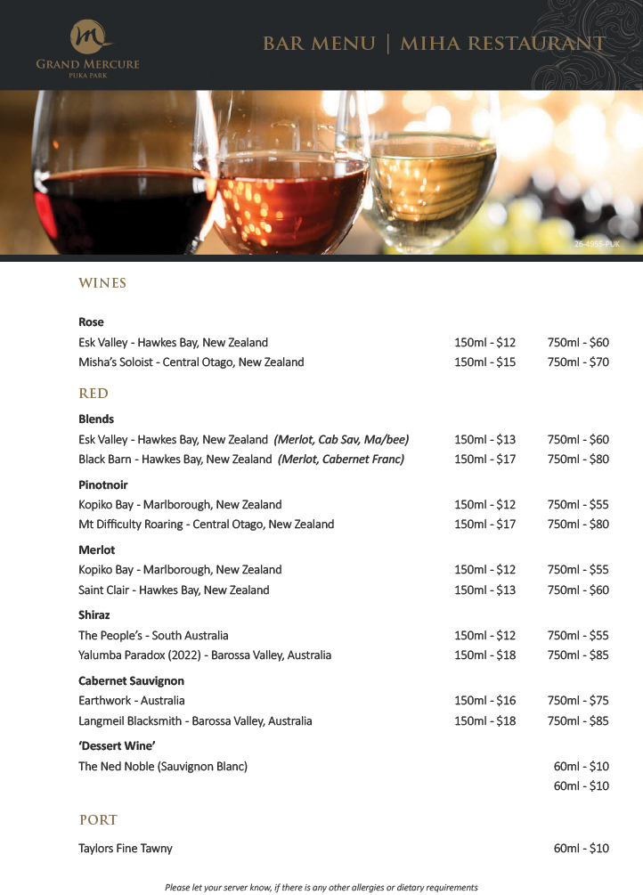 At the award winning Miha restaurant, you can be sure of a sumptuous dining experience in elegant surrounds, or dine al fresco on the large outdoor deck, with the Pacific Ocean as your backdrop.